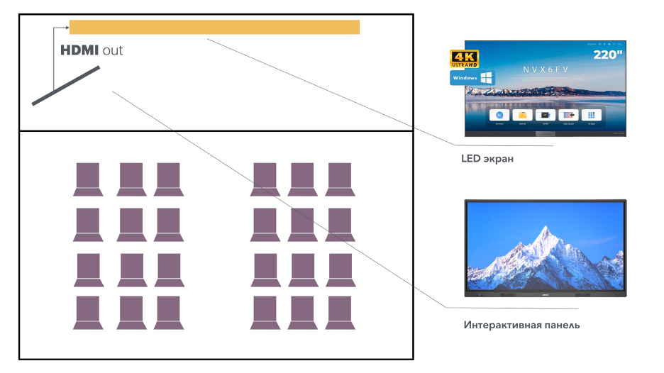 У всех интерактивных панелей портфеля DIGIS есть порт HDMI OUT, который позволяет передать изображение и звук от панели в любое другое устройство отображения, например: большой экран.