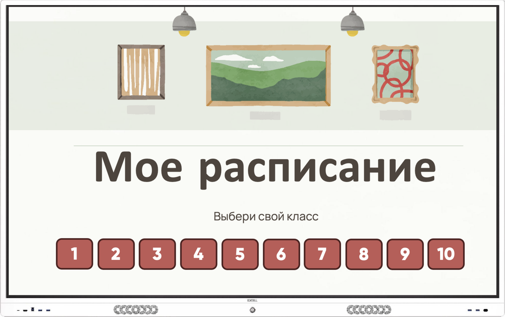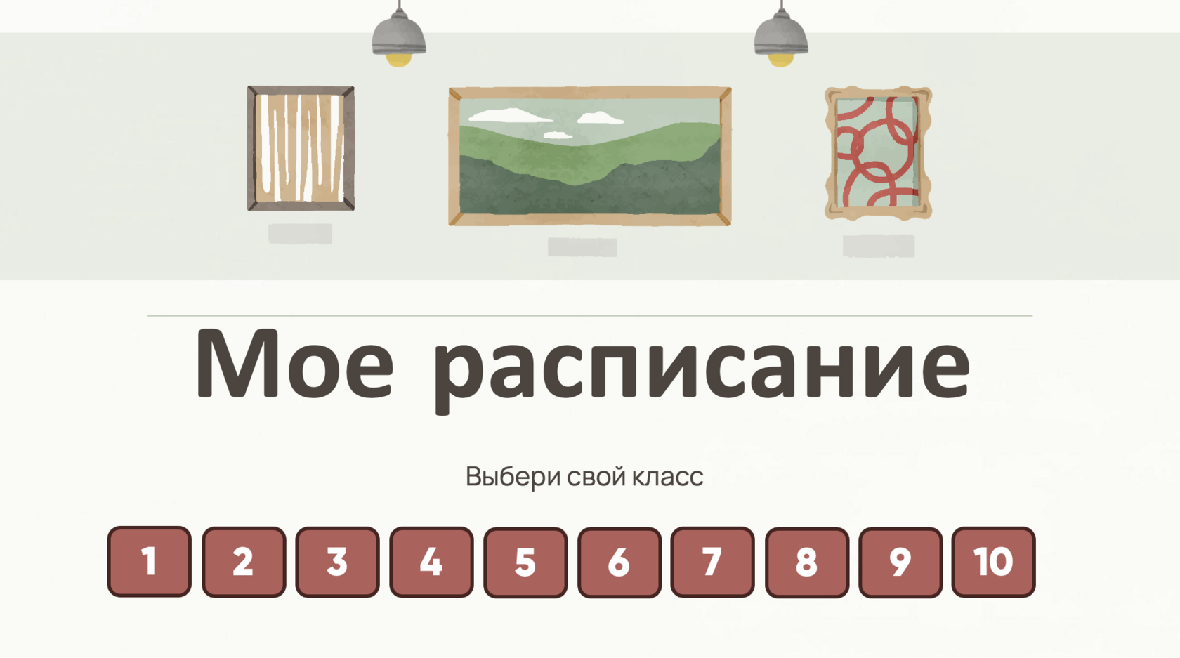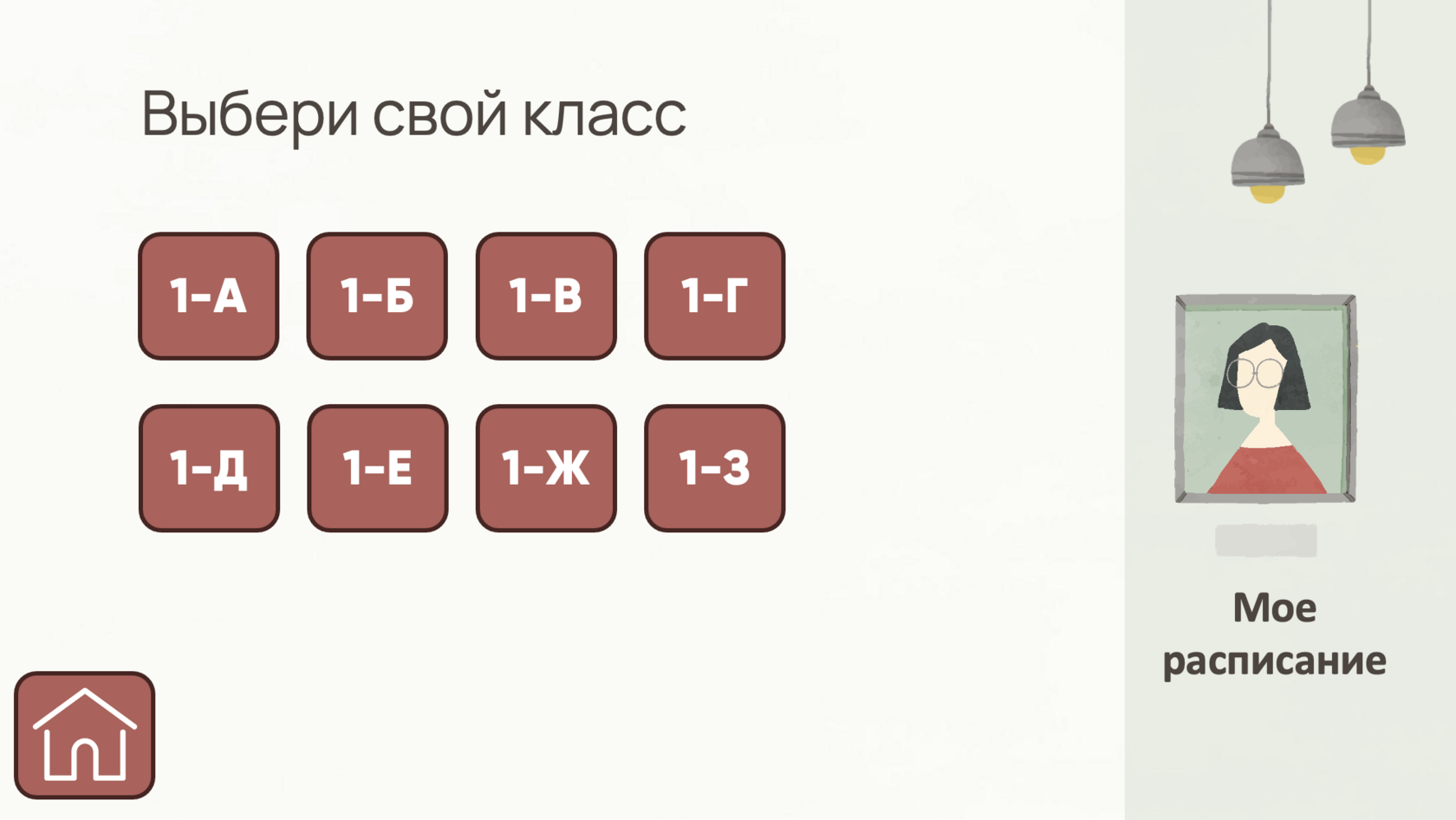 Принцип работы данного расписания следующий: ученик подходит к расписанию. На главной странице он выбирает номер класса, а при нажатии на номер – выбирает литеру класса. После нажатия на кнопку с номером и литерой класса (например: «1-Б») ребенок получает доступ к компактному расписанию занятий без лишней информации.