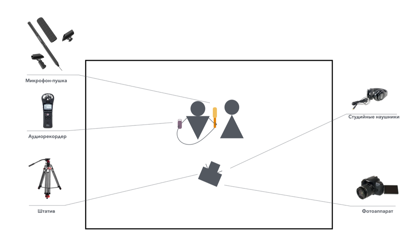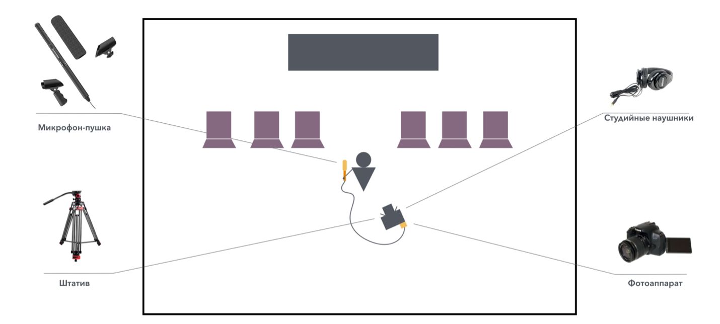 Для записи интервью с экспертом или очевидцами события вы можете использовать как микрофон-пушку для съемки в шумном месте, так и микрофон-петличку. Иногда длины проводного микрофона может быть недостаточно для того, чтобы выстроить кадр. В этом случае вы можете подключить микрофон к записывающему устройству (аудиорекордеру). Мы рекомендуем вам записывать звук как на камеру, так и на рекордер для легкости совмещения аудиодорожек при последующем монтаже.