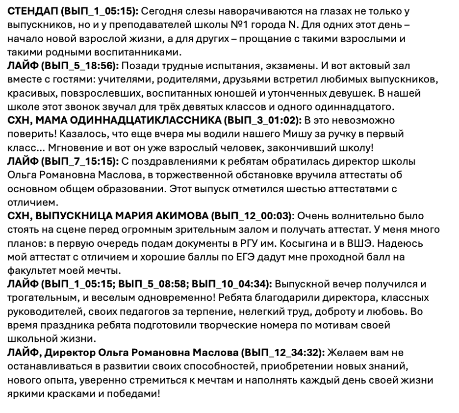 - Внутри каждого структурного элемента указывается текст, который либо начитывается в студии после утверждения. либо уже записан на месте.