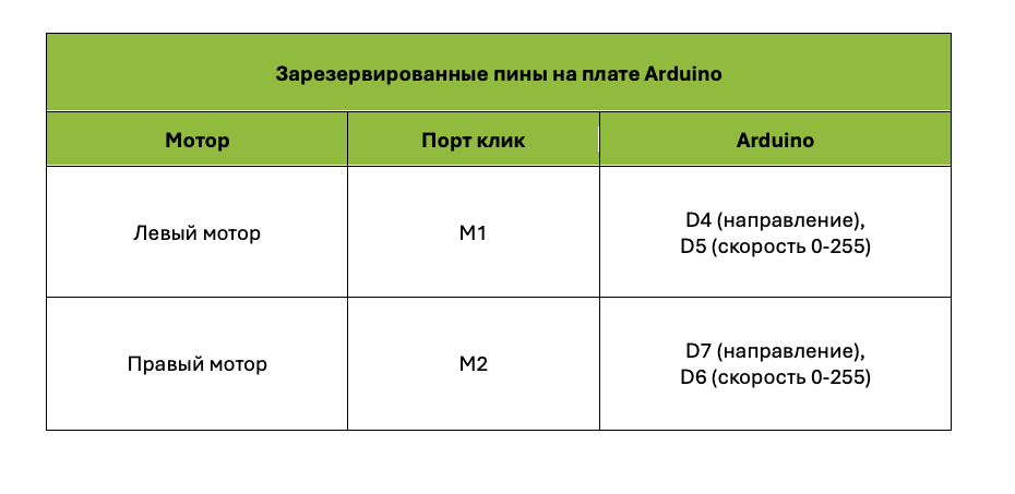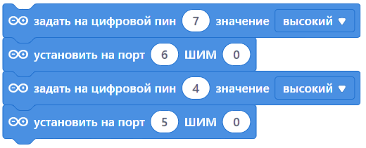 Допустим, что двигатель подключён к порту М1, соответственно, необходимо прописать в блоке с «пин» цифру «4», а в блоке с «ШИМ» - «5». Далее необходимо задать направление и скорость.