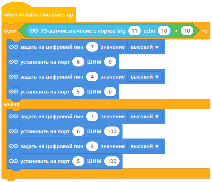 Данная программа позволяет нашему роботу останавливаться при обнаружении препятствия, которое находится на расстоянии менее 10 см.