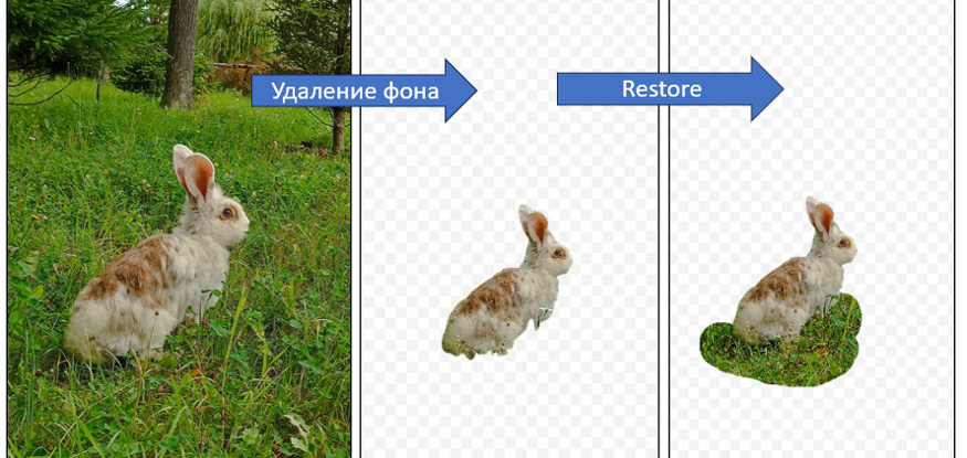 В нашем примере ниже, удалить фон "чисто" невозможно, поскольку ноги кролика закрыты травой. На первом шаге мы удалили фон, на втором, с помощью Restore восстановили небольшой фрагмент, чтобы изображение было естественным. Готово. Можно использовать для карточки К-кролик!